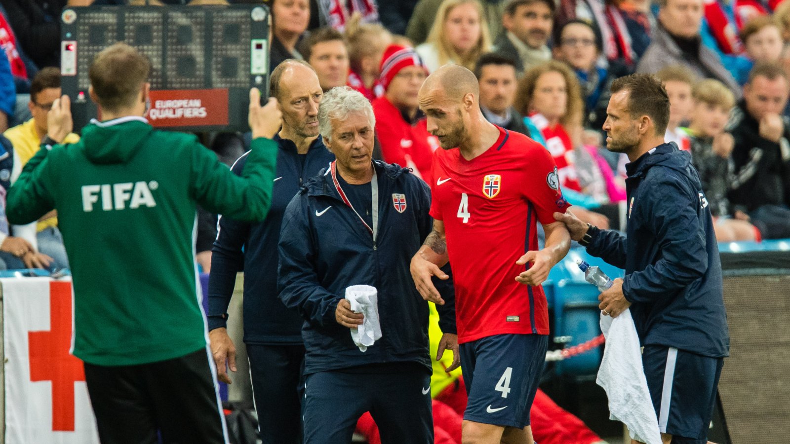 Tore Reginiussen måtte gi seg i 1. omgangen mot Tsjekkia etter å ha fått en smell i hodet. Midtstopperen fikk synstrøbbel og klarte ikke å spille videre.