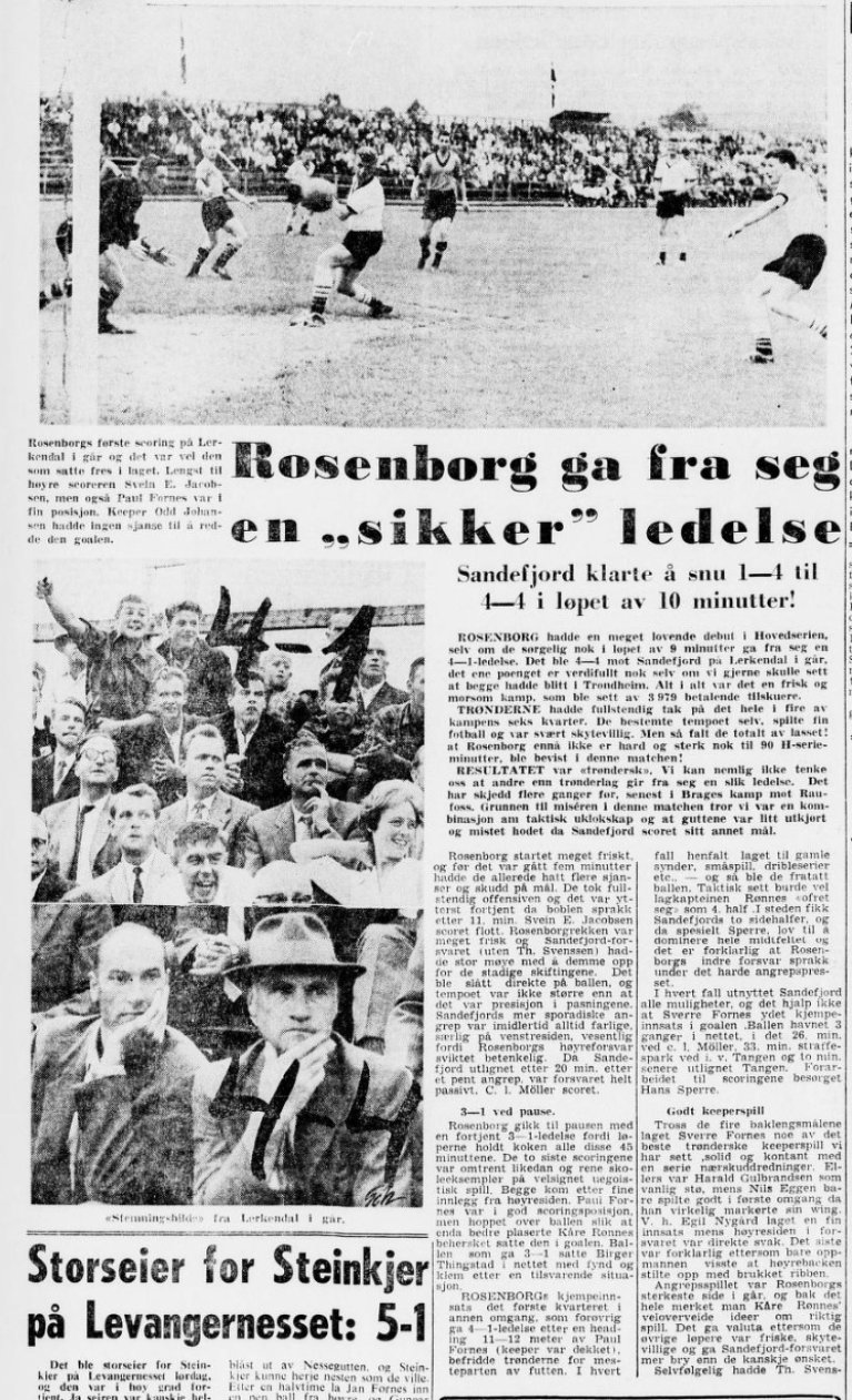 Rosenborgs aller første scoring i toppdivisjonen kom i Hovedserie-debuten på Lerkendal 31. juli 1960. Svein Erik Jakobsen ga hjemmelaget ledelsen over Sandefjord etter bare 11 minutter. Tyve minutter før slutt ledet RBK hele 4–1, men i løpet av ti minutter sprakk laget fullstendig og Sandefjord satte inn tre mål og utlignet til 4–4.