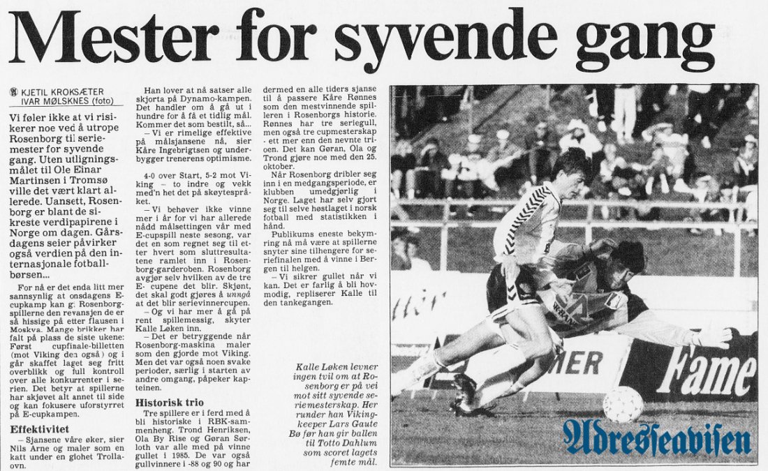 27. september 1992 var Rosenborg på full fart mot nok et seriegull. Og møtet med Viking på Lerkendal ble en maktdemonstrasjon. Bent Skammelsrud, Kalle Løken og Gøran Sørloth ga hjemmelaget 3–0 etter en halvtimes spill. Sistnevnte leverte da scoring nr 1000 for RBK i toppdivisjonen.