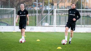 Stor glede for første gjennomførte fotballøkt med ball for Yann-Erik de Lanlay og Andreas Helmersen siden kneskadene.